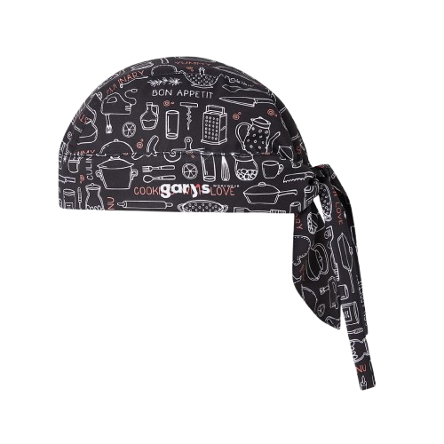 * Diseño unisex, ideal para chefs y cocineros.* Ajuste personalizado con tiras para anudar.* Rizo absorbente en la frente, para mayor confort.* Tejido sublimado, con estampados de alta calidad y larga duración.* Microfibra 100% poliéster, transpirable, ligera y resistente.* Fácil de lavar y mantener, perfecto para el uso diario.