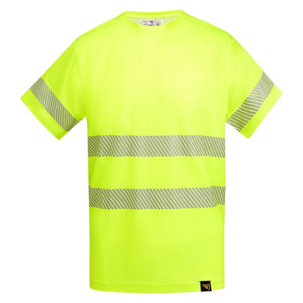 Camiseta técnica de alta visibilidad de manga corta. Cuello redondo en tejido principal. Dos cintas reflectantes segmentadas en torso y una en mangas. Tejido mezcla en poliéster y algodón para mayor comodidad y transpirabilidad.55% Algodón y 45% poliéster, 170 g/m²